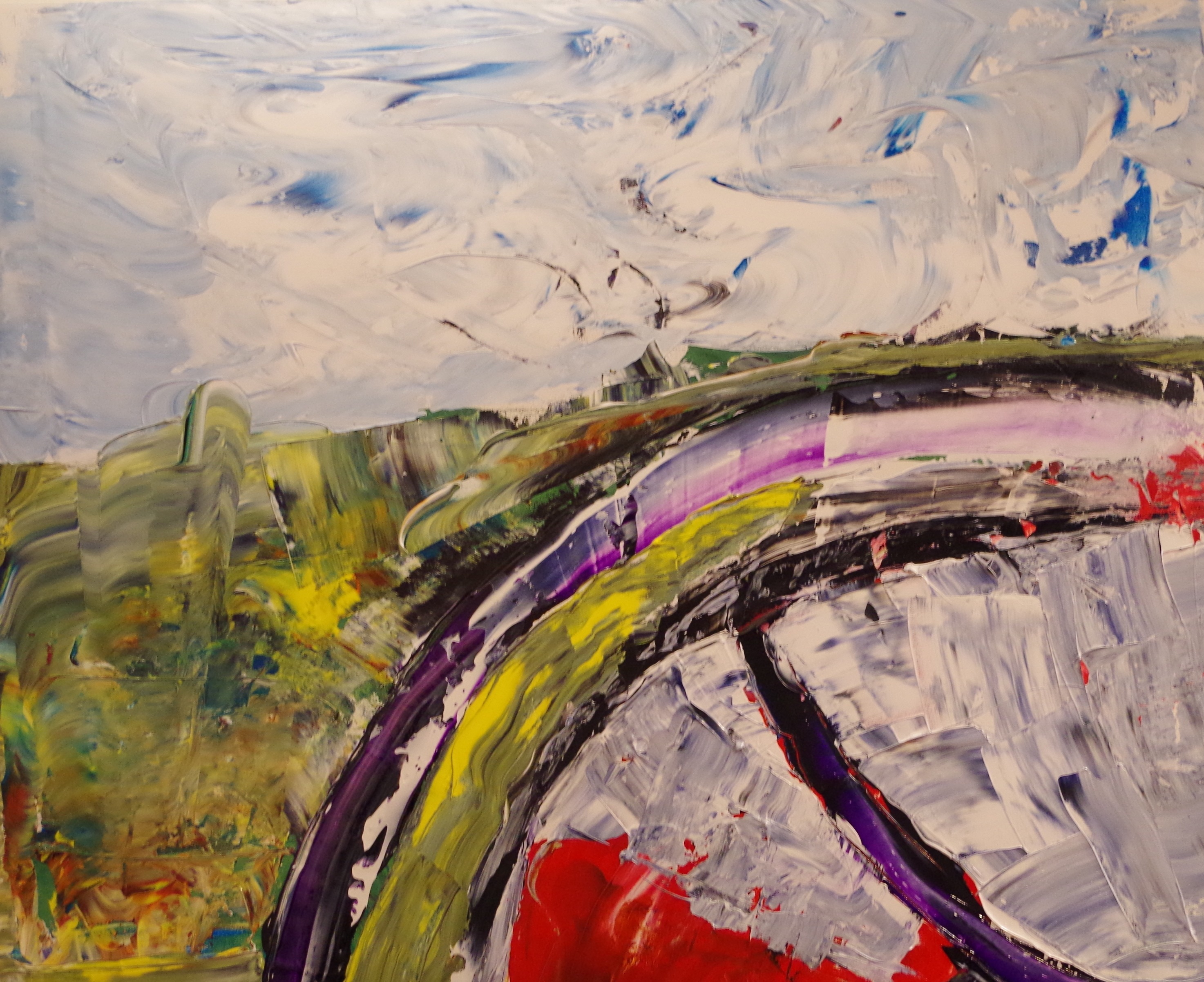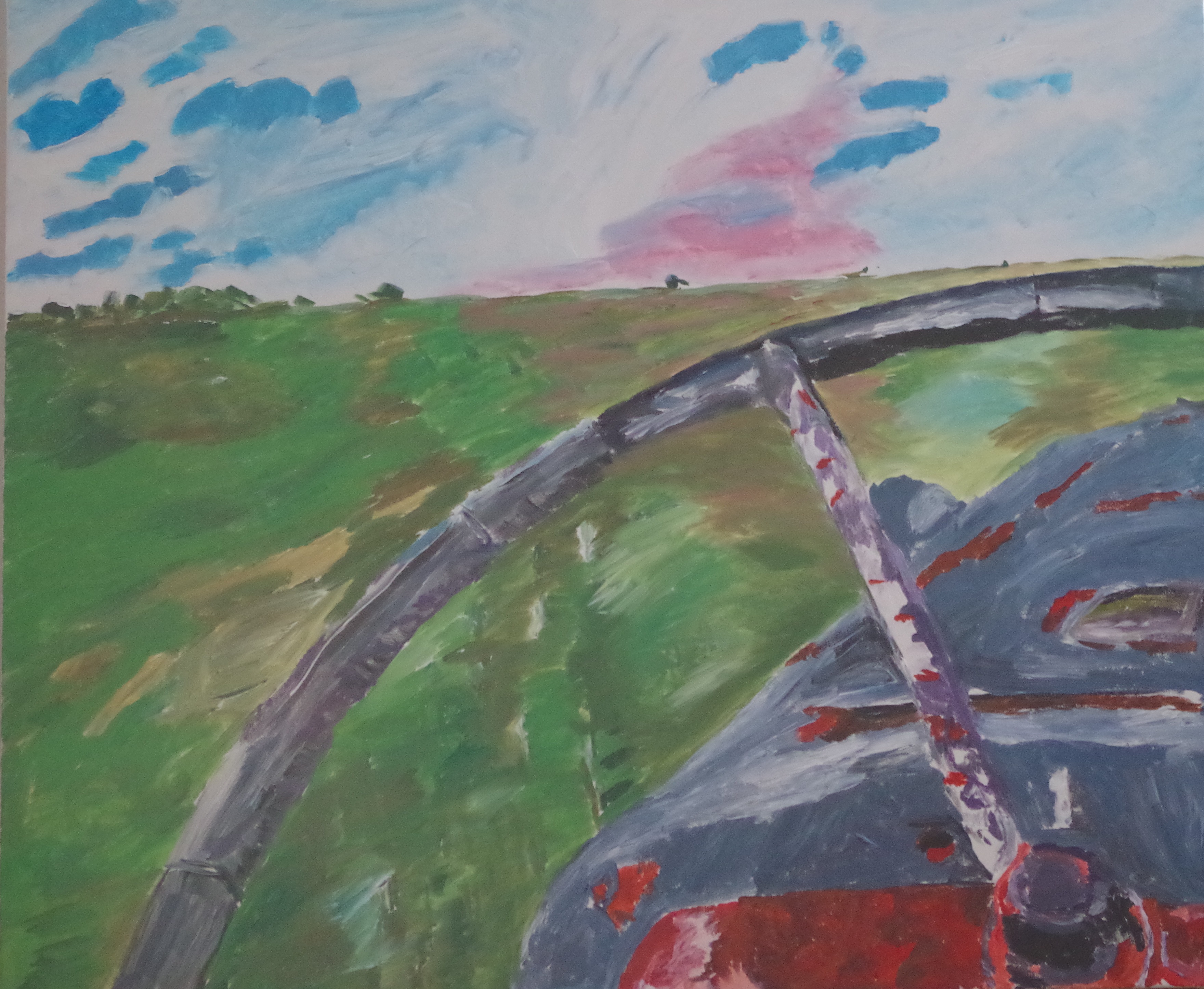 This is ‘Field From Ford’ and ‘Field From Ford morph’. It is a beautiful day here with the sun gloriously shining, yet I feel blue that the painting in this project is done. I am sure I will still go back into the works, hope I don’t destroy them but I can’t guarantee their safety. I look at them and think some of them seriously suck. Yet here I am submitting them to a local library gallery for show. Who knows what they may think of them in the end, wait and see. I do like these two. Is it part of bringing them forth that I like the recent ones? Is this a normal feeling when creating? A dislike of the fruits of labour. That’s all I have for the moment, going to find some chocolate to fight the funk.