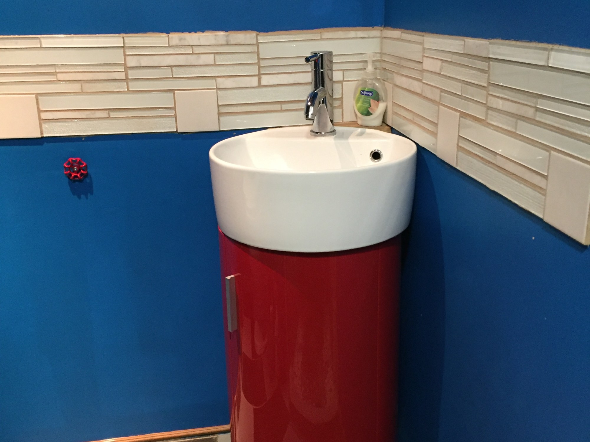 the lovely basement bathroom has tile and towel hangers up! so much fun in popping color. Love it!