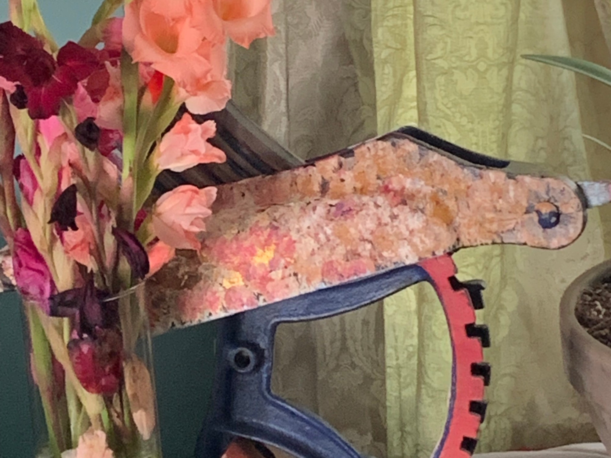 Henrietta is still around our house. I love the gladiolas color bounce with her!