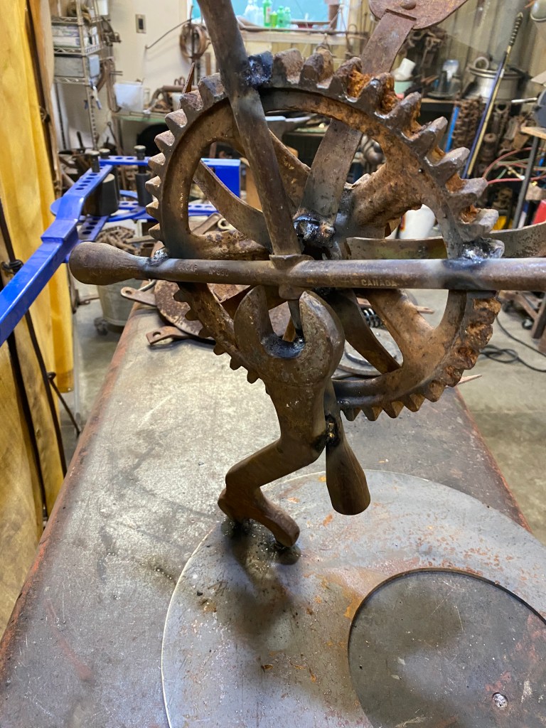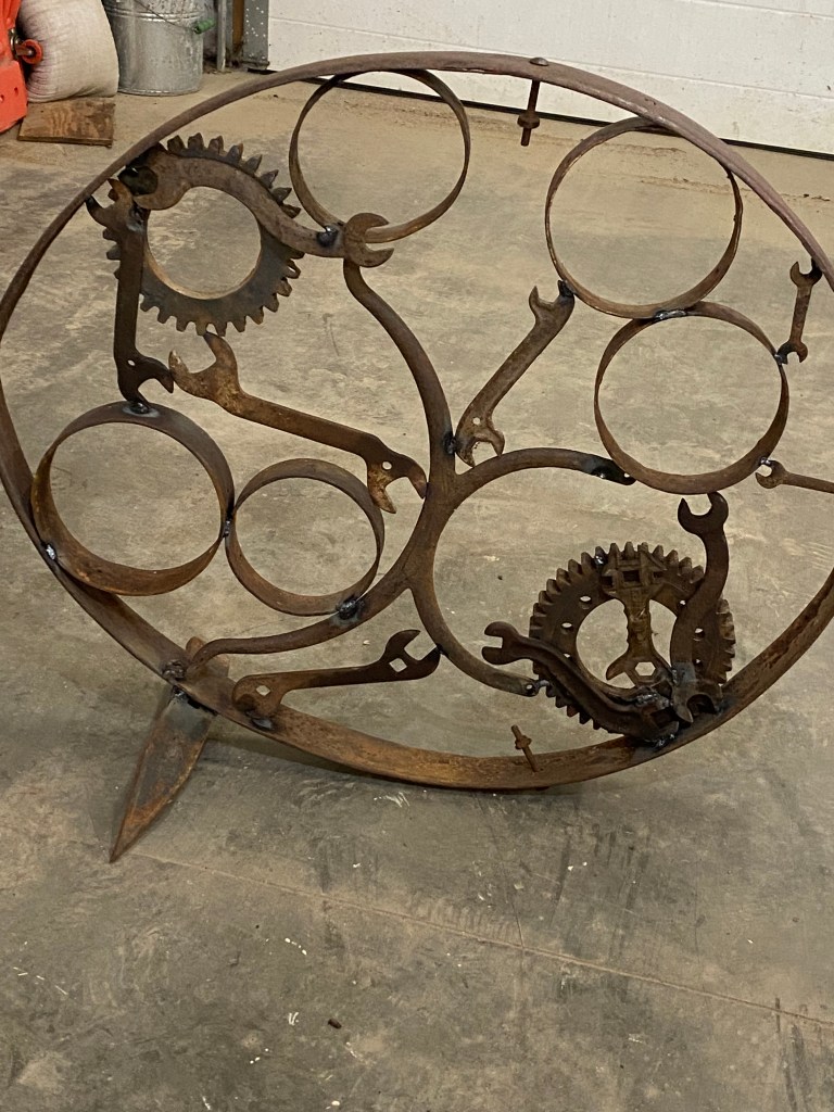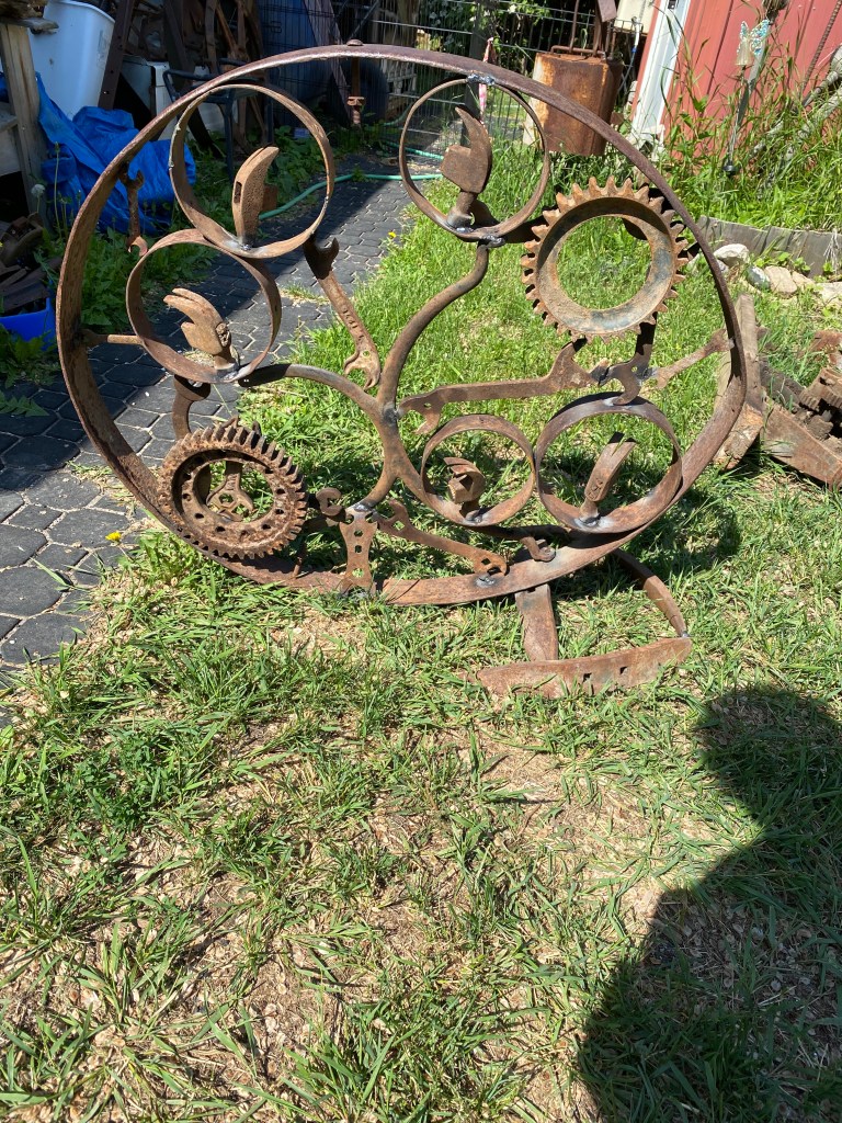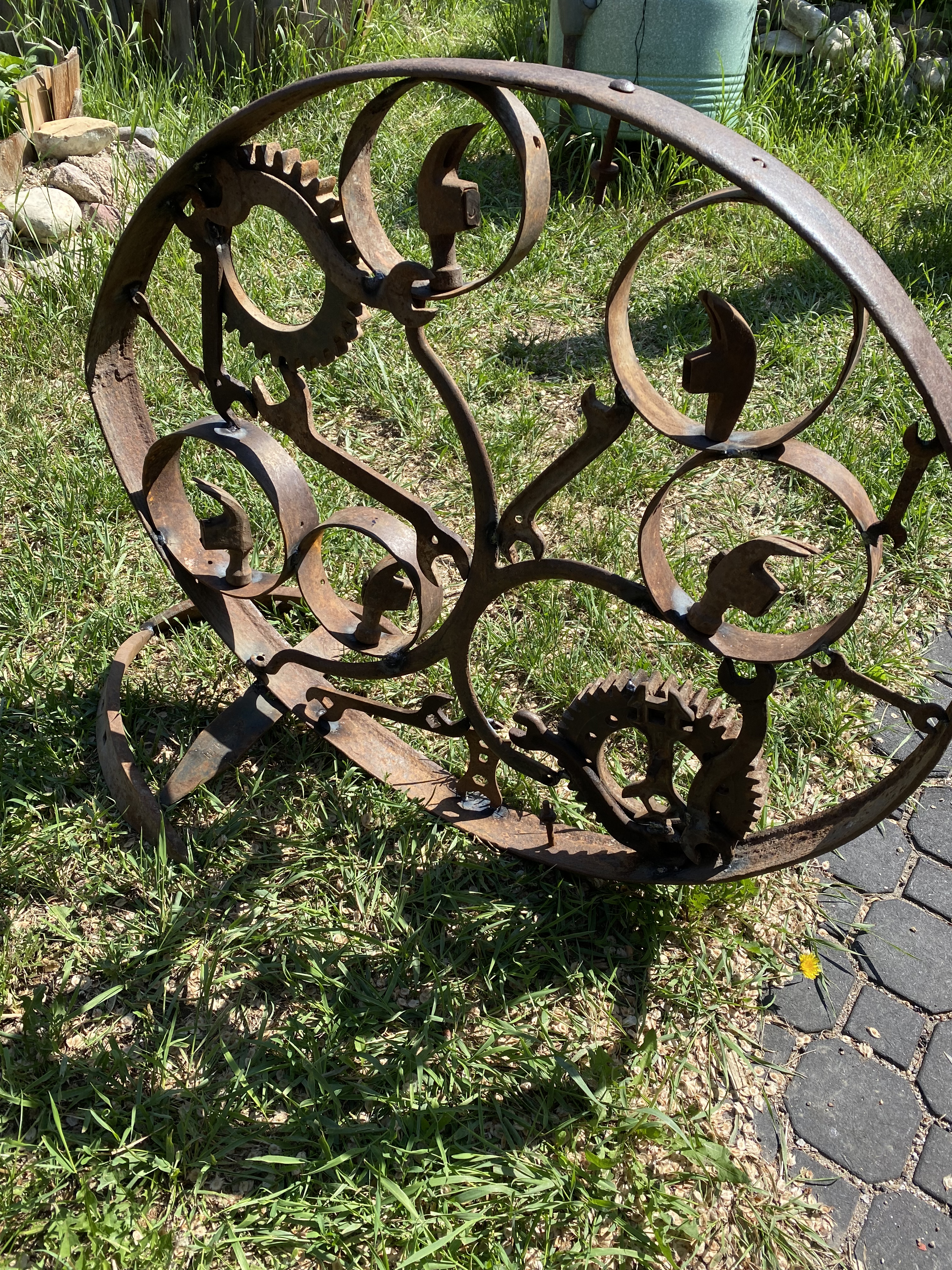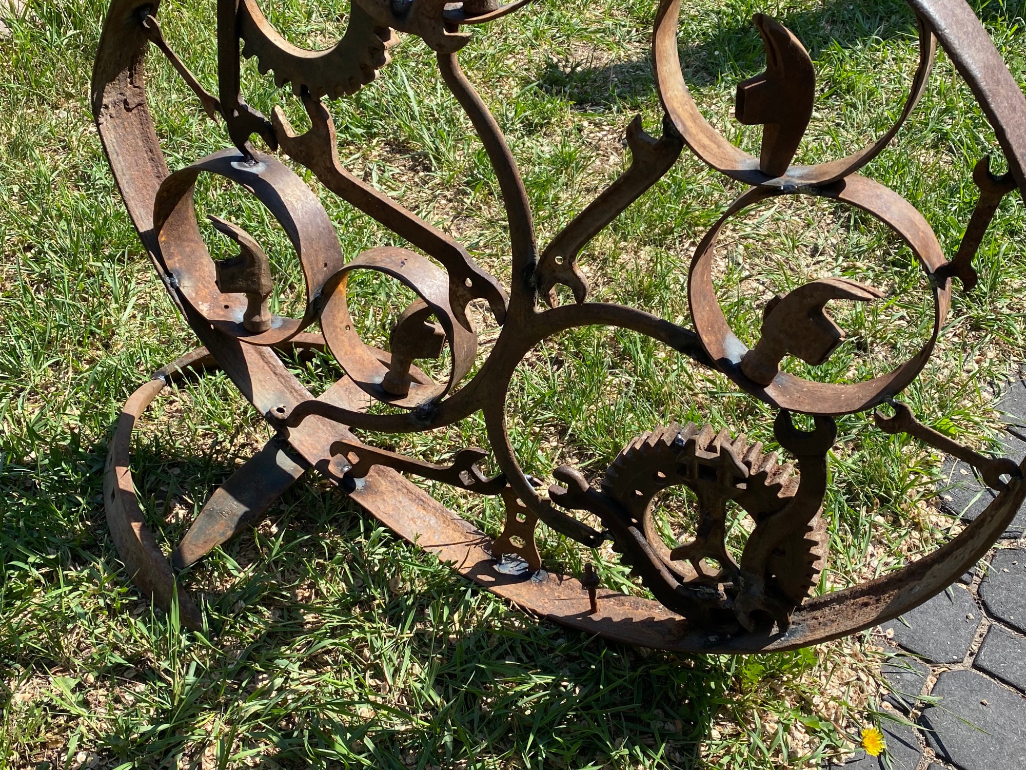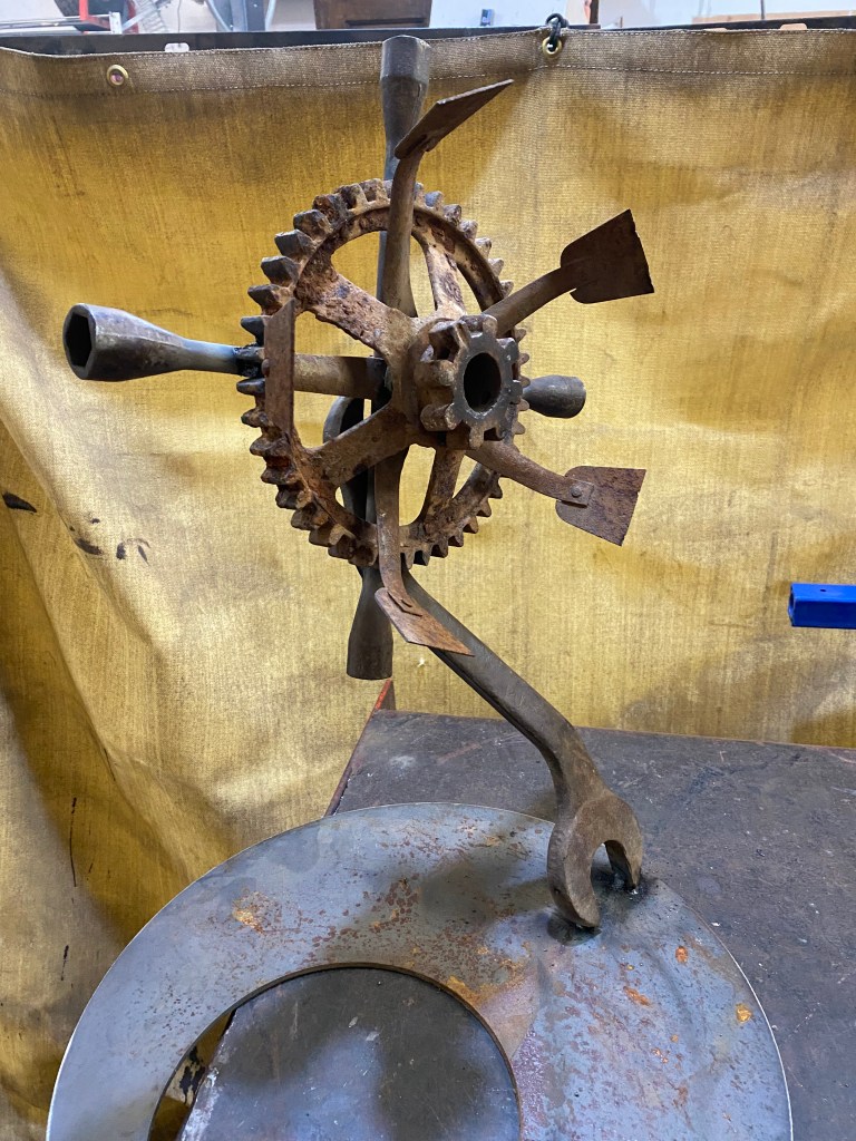 In progress. a wheel from a tillage implement, probably wrought iron. gears and wrenches.Midwaycomplete. the hammer heads, playing inside at different tilts. makes me smilethere will be some cool looking light dances. πbackside of a narly flowerbalanced! i weld with stick. I weld into rust, not clean metal. I weld while holding onto my parts. very little use of blocking. the impact of playing with gravity, disregard for pristine material allows me to expand my potential. A professional, skilled trades person knows better than to do this. my defiance and sets me up to find alternatives that preserve the rust. I have works that hold significant weight and are weathering the elements for 15 years. the rust will still progress, ever so slowly. the works are not meant to be around till end of the earth. I would guess that the one gear in this flower is 75 to 80 yrs old. the rust will continue blossom, unless i put on rust convertor… options. but love the rust.
